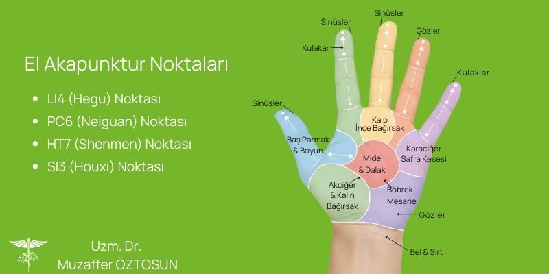El üzerindeki akupunktur noktaları, geniş bir kullanım alanına sahiptir. Ancak her rahatsızlıkta aynı noktaların kullanılması söz konusu değildir. Kişisel değerlendirme ve doğru planlama esastır.