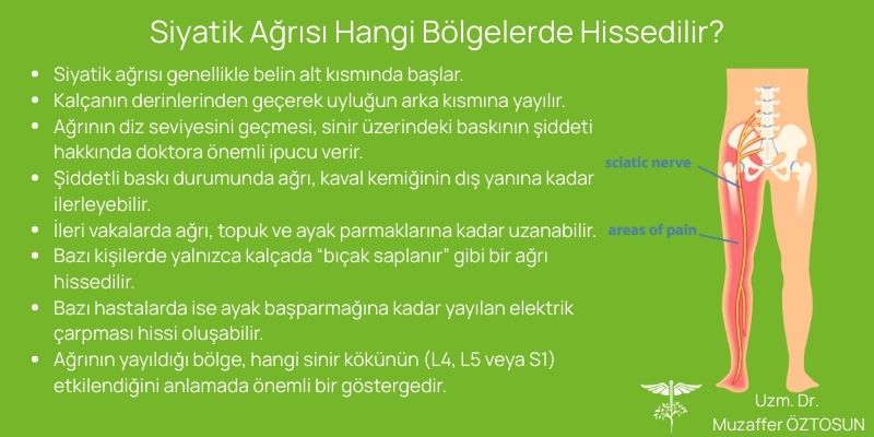 Bu ağrının yol haritası, sinirin geçtiği güzergahla birebir uyumludur. Genellikle belin alt kısmından başlayan Siyatik Ağrısı, kalçanın derinliklerinden geçerek uyluğun arka kısmına yayılır. Ağrının diz seviyesini geçip geçmemesi, baskının şiddeti hakkında hekime önemli ipuçları verir.